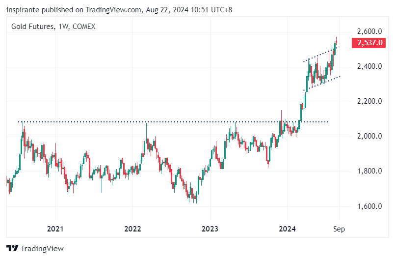 We would consider taking a long position on Gold futures (GCZ4) at the present level of 2540, with a stop-loss below 2510, which could bring us a hypothetical maximum loss of 30 points. Looking at Figure 4, if the breakout mirrors the one in March, gold has the potential to continue to climb to 2650, a hypothetical gain of 110 points. Each move in the Gold futures contract is 100 USD. Micro Gold futures are also available at 1/10 the size of the standard contract.