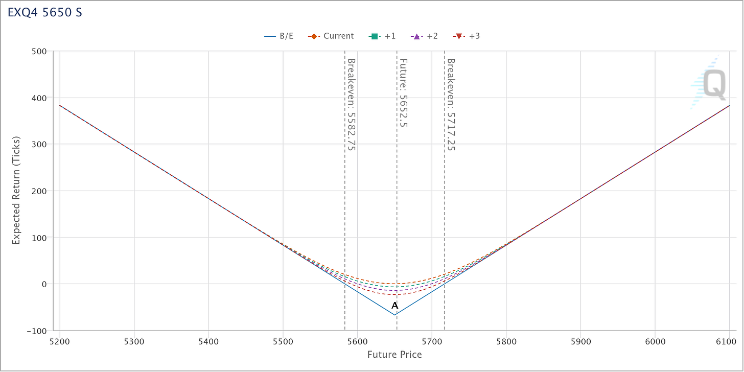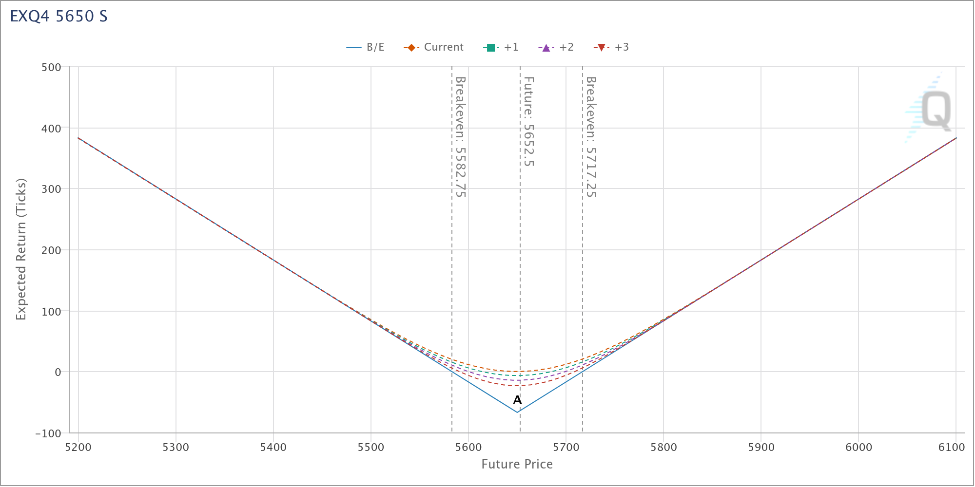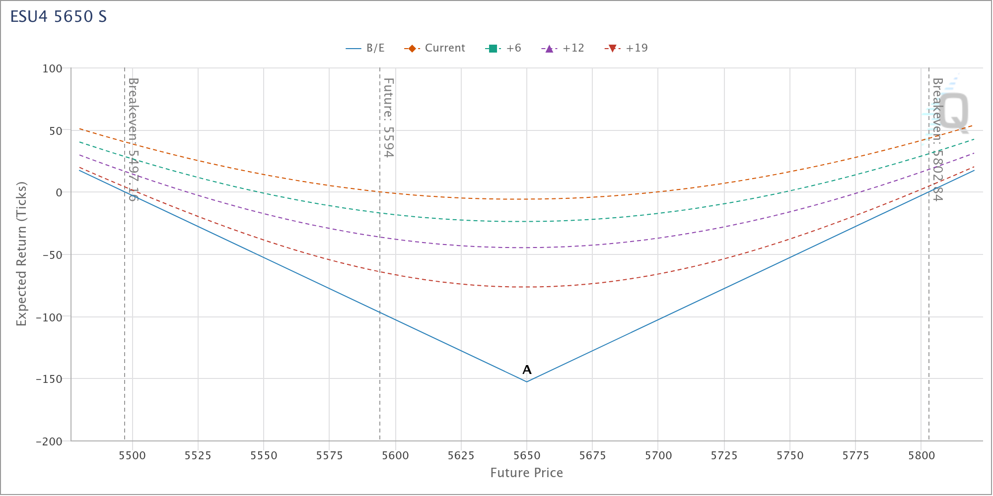 The same straddle strategy can be adopted for the Micro E-mini S&P500 index futures, which is 1/10 the size of the E-mini contract. The at-the-money call option (EXQ4 5650 C) and at-the-money put option (EXQ4 5650 P), that expire in late September, have premiums of 34.86 and 32.36 respectively. This puts the total premium to 67.22 (=34.86+32.36) points, or 5 x 67.217 = 336.10 USD. At expiration, if the E-mini S&P500 index futures price is above 5650+67.22 = 5717.22 or below 5640-67.22= 5582.78, the position would be in profit.