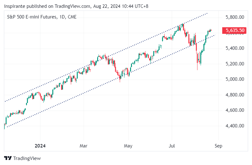 Following the early August selloff, the S&P500 rebounded with eight consecutive days of gains, returning to its upward-trending channel.