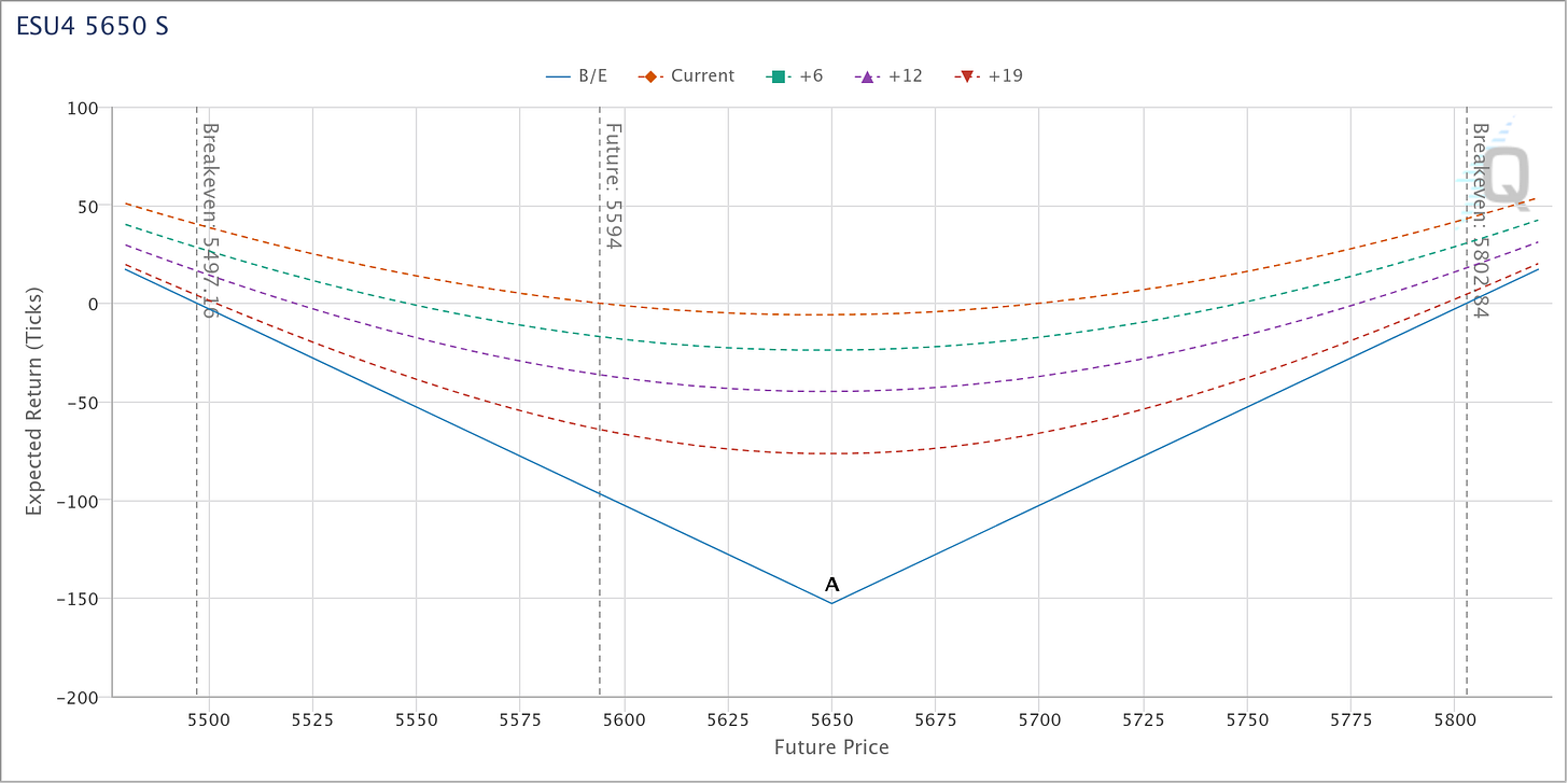 We would consider taking a long straddle position on E-mini S&P500 index futures by buying 1 E-mini S&P500 index at-the-money call option that expire in late September (ESU4 5650 C), at a premium of 48.53 points, and buying 1 E-mini S&P500 index at-the-money put option that expire in late September (ESU4 5640 P), at a premium of 104.31 points. This puts the total premium to 152.84 (=48.53+104.31) points, or 50 x 152.84 = 7642 USD, the maximum potential loss for the position. At expiration, if the E-mini S&P500 index futures price is above 5650+152.84 = 5802.84 or below 5640-152.84 = 5497.16, the position would be in profit. The payout diagram below is generated by CME QuikStrike’s Trade Example Simulator.