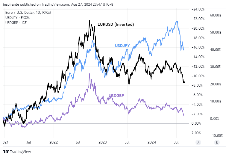 When compared against major currencies like the EUR, JPY, and GBP, the U.S. Dollar has experienced significant depreciation. This decline is evident as these foreign exchange rates against the USD approach key levels last seen before the Federal Reserve's rate hike cycle began in March 2022.