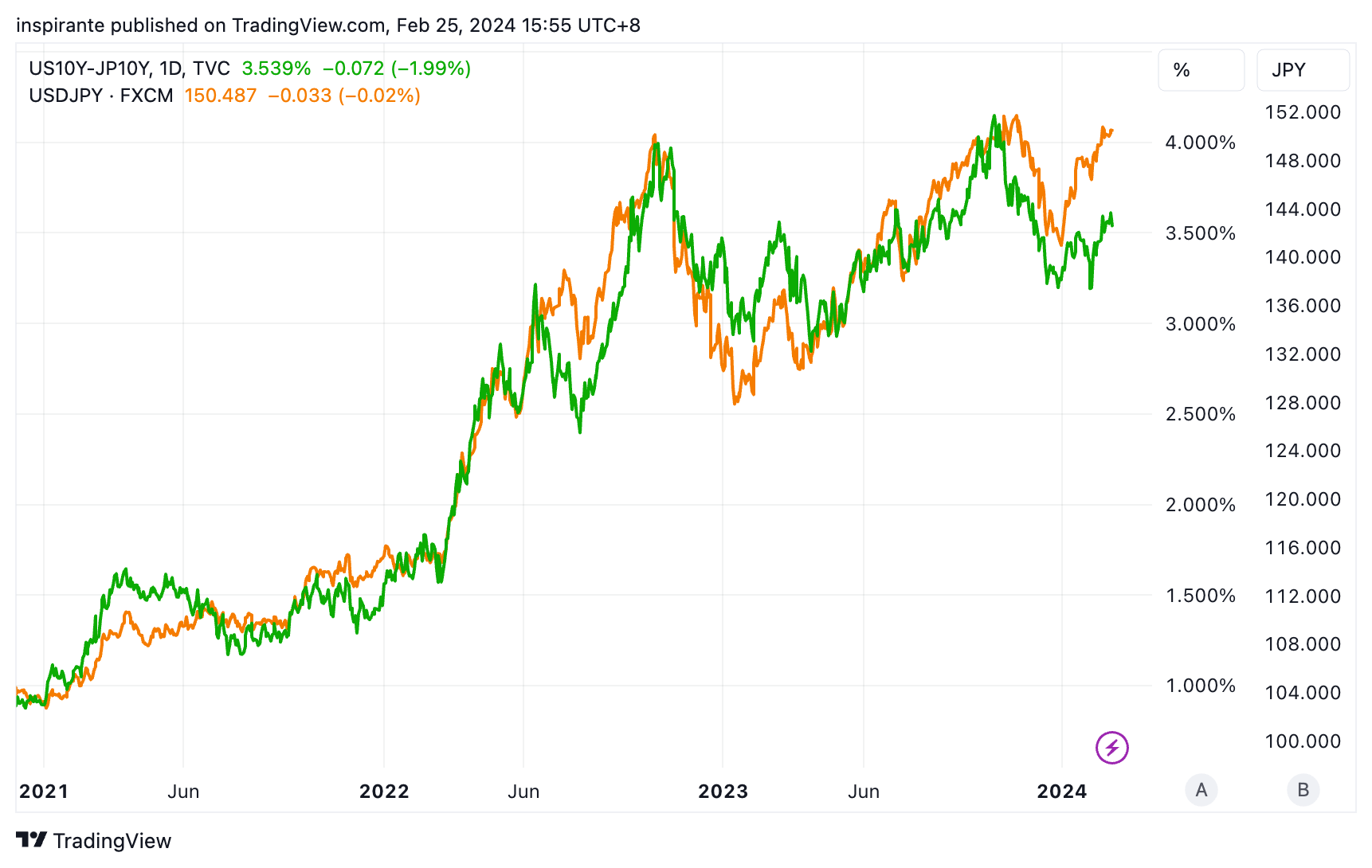 Since 2020, the USD/JPY and the U.S. 10-year yield have moved in tandem, primarily driven by U.S. bond yield dynamics influencing the yield differentials between the U.S. and Japan. Recently, a divergence has emerged, with the USD/JPY experiencing a much sharper rise compared to the modest bounce in the U.S. 10-year yield since the end of last year.
