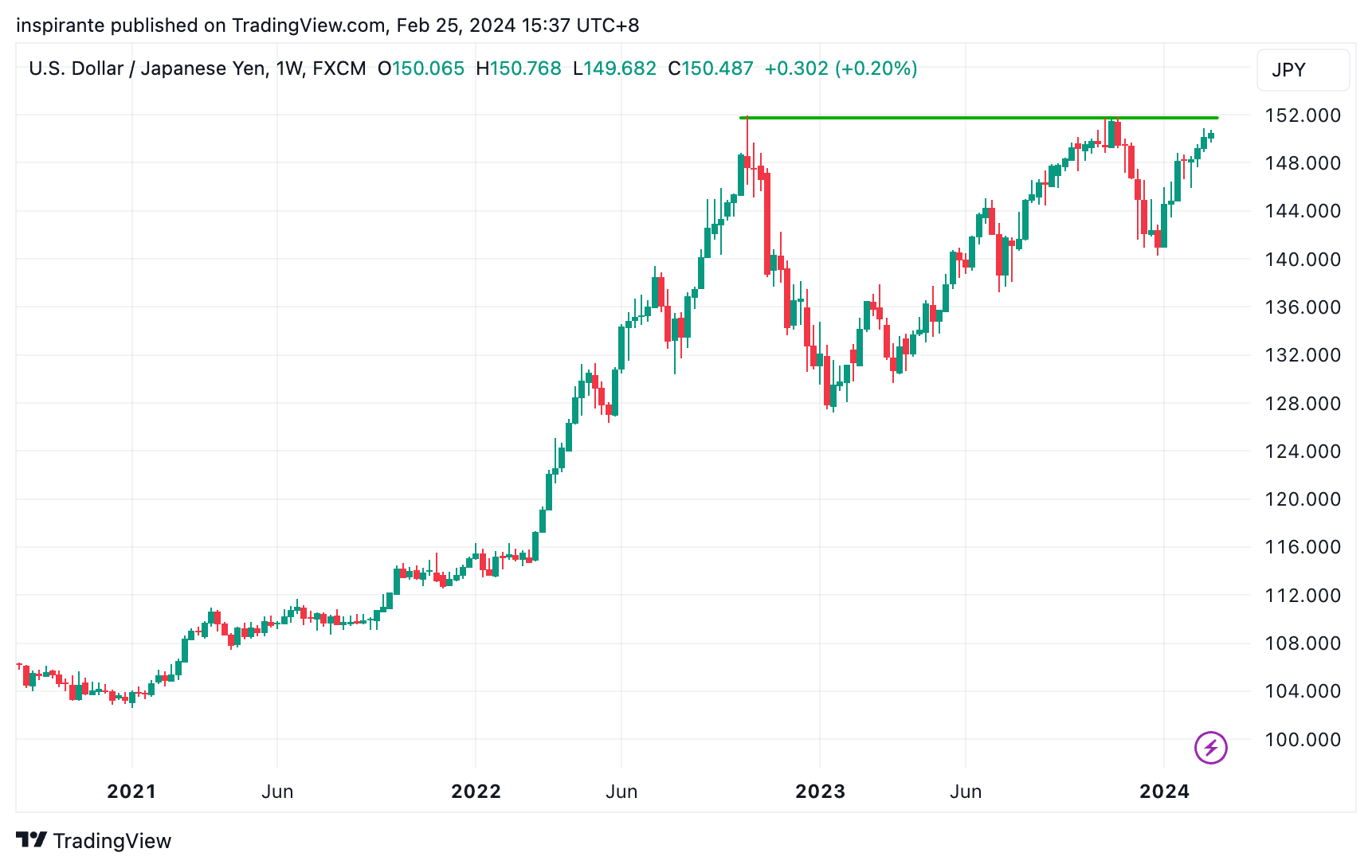 The USD/JPY pair has breached the 150 level, forming a distinct Cup-and-Handle continuation pattern. The 152 level represents a significant resistance point; failure to maintain this could signal a further weakening of the Japanese Yen against the U.S. dollar.