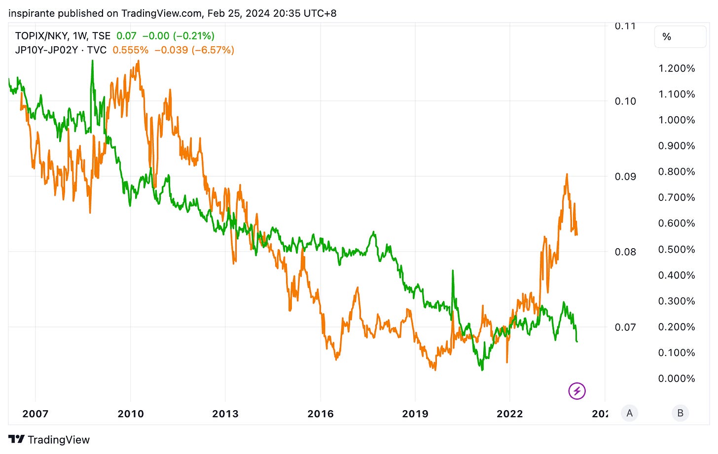 We would consider taking a long position on the synthetic TOPIX/Nikkei 225 ratio by buying 3 TOPIX March 2024 future (TPYH4) at 2,660 and selling 2 Nikkei 225 March 2024 future (NIYH4) at 39,470, with the price ratio at 2,660 / 39,470 = 0.0674. We would put a stop-loss below 0.064, which could bring us a hypothetical maximum loss of 0.0034 points. Each point move in the TOPIX futures contract is 5,000 Yen, and each point movein the Nikkei 225 futures contract is 500 Yen. Both legs have similar notional values (TOPIX: 2,660 x 5,000 x 3 = 39,900,000 Yen and Nikkei 225: 39,470 x 500 x 2 = 39,470,000 Yen). We can look at two hypothetical scenarios to understand the approximate amount of a 0.001 point move in the ratio. Assuming the TOPIX stays unchanged, and the Nikkei 225 drops to 38,888, the ratio becomes 2,660 / 38,888 = 0.0684. The overall profit, which only comes from the Nikkei 225 position in this case, is (39,470 – 38,888) x 500 x 2 = 582,000 Yen. Assuming the Nikkei 225 stays unchanged, and the TOPIX drops to 2,621, the ratio becomes 2,621 / 39,470 = 0.0664. The overall loss, which comes from the TOPIX position in this case, is (2,660 – 2,621) x 5,000 x 3 = 585,000 Yen. There is margin offset for TOPIX/Nikkei 225 ratio spreads.
